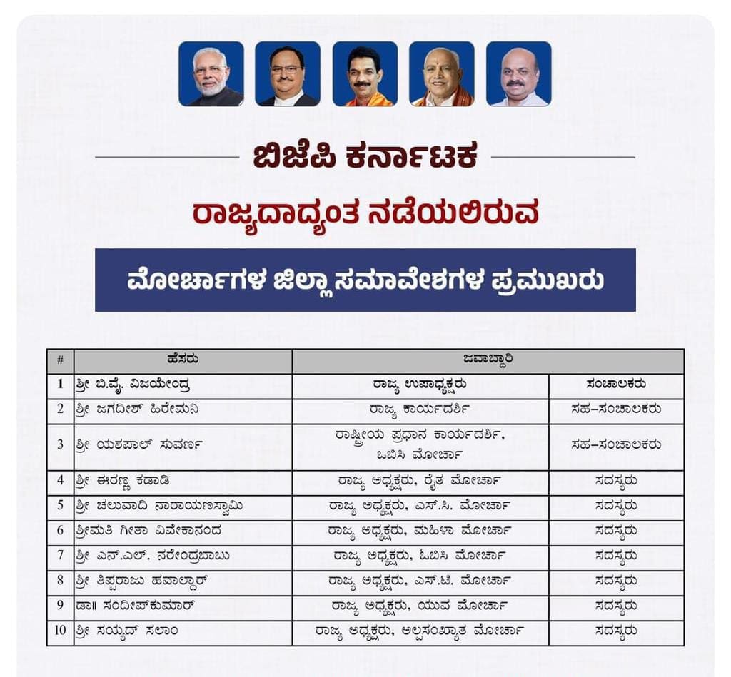 ಬಿಜೆಪಿಯ ಏಳು ಮೋರ್ಚಾ ಗಳ ಜಿಲ್ಲಾ ಸಮಾವೇಶದ ಸಂಚಾಲಕರಾಗಿ ವಿಜಯೇಂದ್ರ ಅವರನ್ನು ನೇಮಕ ಮಾಡಲಾಗಿದೆ.