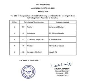ಕಾಂಗ್ರೆಸ್ ರಾಯಚೂರು ನಗರ ವಿಧಾಸಭಾ ಕ್ಷೇತ್ರಕ್ಕೆ ಮೊಹಮ್ಮದ್ ಶಲಾಂ, ಶಿಡ್ಲಘಟ್ಟ ವಿಧಾಸಭಾ ಕ್ಷೇತ್ರಕ್ಕೆ ಬಿ ವಿ ರಾಜೀವ್ ಗೌಡ, ರಾಜಧಾನಿ ಬೆಂಗಳೂರಿನ ಸಿ ವಿ ರಾಮನ್ ನಗರ ವಿಧಾನಸಭಾ ಕ್ಷೇತ್ರಕ್ಕೆ (ಪರಿಶಿಷ್ಟ ಜಾತಿ ಮೀಸಲು ) ಎಸ್.ಆನಂದ್ ಕುಮಾರ್, ಅರಕಲಗೂಡು ವಿಧಾನಸಭಾ ಕ್ಷೇತ್ರಕ್ಕೆ ಎಚ್.ಪಿ ಶ್ರೀಧರ್ ಗೌಡ, ಮಂಗಳೂರು ನಗರ ಉತ್ತರ ವಿಧಾನಸಭಾ ಕ್ಷೇತ್ರಕ್ಕೆ ಇನಾಯತ್ ಅಲಿ ಎಂಬುವವರಿಗೆ ಟಿಕೆಟ್ ನೀಡಲಾಗಿದೆ.