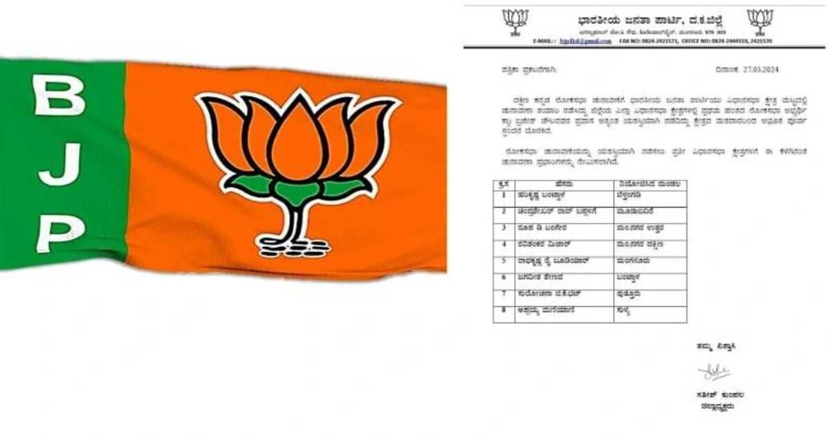 Dakshina Kannada Elction in charge: ದಕ್ಷಿಣ ಕನ್ನಡ ಲೋಕಸಭಾ ಚುನಾವಣೆಗೆ ಭಾರತೀಯ ಜನತಾ ಪಾರ್ಟಿಯು ವಿಧಾನಸಭಾ ಕ್ಷೇತ್ರಗಳಿಗೆ ಈ ಕೆಳಗಿನಂತೆ ಚುನಾವಣಾ ಪ್ರಭಾರಿಗಳನ್ನು ನೇಮಿಸಿದೆ.