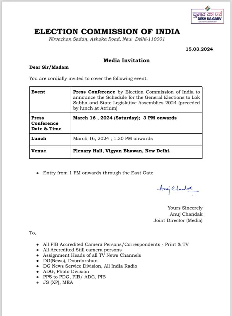 ಚುನಾವಣಾ ಆಯೋಗವು ಶುಕ್ರವಾರ (ಇಂದು) ಲೋಕಸಭಾ ಚುನಾವಣೆ ಮತ್ತು ಕೆಲವು ರಾಜ್ಯ ವಿಧಾನಸಭೆಗಳ ವೇಳಾಪಟ್ಟಿಯಲ್ಲಿ ಮಾರ್ಚ್ 16 ರಂದು ಪ್ರಕಟ ಮಾಡುವುದಾಗಿ ತಿಳಿಸಿದೆ. ಸಾಮಾಜಿಕ ಮಾಧ್ಯಮ ವೇದಿಕೆಗಳಲ್ಲಿ ಚುನಾವಾಣಾ ಆಯೋಗದ ಪತ್ರಿಕಾಗೋಷ್ಠಿಯನ್ನು ವೇದಿಕೆಗಳಲ್ಲಿ ನೇರ ಪ್ರಸಾರ ಮಾಡಲಾಗುವುದು ಎಂದು ಪ್ರಕಟ ಮಾಡಲಾಗಿದೆ.