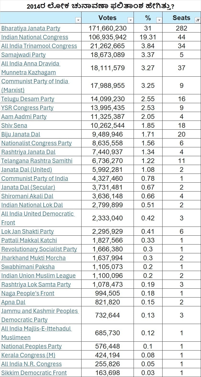 2014ರಲ್ಲಿ ಯಾವ ಪಕ್ಷಗಳು ಎಷ್ಟೆಷ್ಟು ಸ್ಥಾನಗಳನ್ನು ಪಡೆದಿದ್ದವು ಎಂದು ತಿಳಿಯಲು ಈ ಚಾರ್ಟ್ ನೋಡಿ.