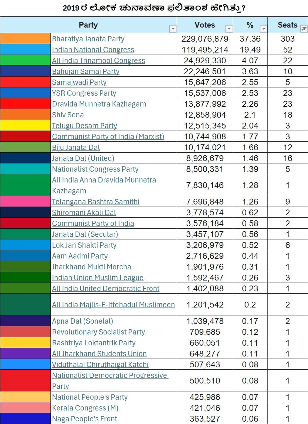 2019ರಲ್ಲಿ ಯಾವ ಪಕ್ಷಗಳು ಎಷ್ಟೆಷ್ಟು ಸ್ಥಾನಗಳನ್ನು ಪಡೆದಿದ್ದವು ಎಂದು ತಿಳಿಯಲು ಈ ಚಾರ್ಟ್ ನೋಡಿ.
