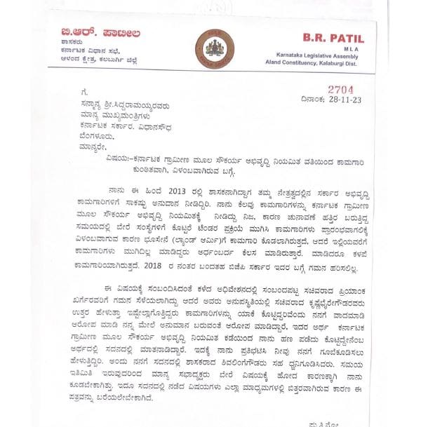 ಅಂದಹಾಗೆ ಪಾಟೀಲ್ ಅವರು ಪತ್ರದಲ್ಲಿ ಕರ್ನಾಟಕ ಗ್ರಾಮೀಣ ಮೂಲ ಸೌಕರ್ಯ ಅಭಿವೃದ್ಧಿ ನಿಯಮಿತ ವತಿಯಿಂದ ನಡೆಸಲಾದ ಕಾಮಗಾರಿ ಕುರಿತಾಗಿ ಗ್ರಾಮೀಣಾಭಿವೃದ್ಧಿ ಪಂಚಾಯತ್ರಾಜ್ ಸಚಿವ ಪ್ರಿಯಾಂಕಾ ಖರ್ಗೆ ಹಾಗೂ ಕಂದಾಯ ಸಚಿವ ಕೃಷ್ಣ ಬೈರೇಗೌಡ ಅವರ ವಿರುದ್ಧ ಆಕ್ರೋಶ ವ್ಯಕ್ತಪಡಿಸಿದ್ದಾರೆ.