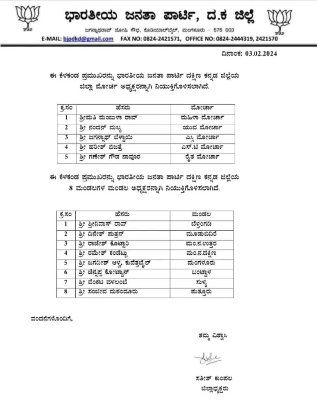 Puttur: ಪುತ್ತೂರು ಮಂಡಲ ಬಿಜೆಪಿ ಅಧ್ಯಕ್ಷರಾಗಿ ಮಾಜಿ ಶಾಸಕ ಸಂಜೀವ ಮಠಂದೂರು ಆಯ್ಕೆ ಎನ್ನುವ ಲೆಟರ್ ಹೆಡ್ವೊಂದು ಇದೀಗ ವೈರಲ್ ಆಗಿರುವ ಕುರಿತು ಬಿಜೆಪಿ ಜಿಲ್ಲಾಧ್ಯಕ್ಷ ಸತೀಶ್ ಕುಂಪ ಅವರು ಮಾಧ್ಯಮವೊಂದಕ್ಕೆ ತಮ್ಮ ಮಾಹಿತಿಯನ್ನು ನೀಡಿದ್ದಾರೆ.