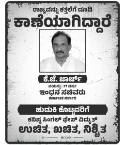 ಕರ್ನಾಟಕದಲ್ಲೆಲ್ಲಾ ಕತ್ತಲೆ ಹರಡಿ ನಾಪತ್ತೆಯಾಗಿರುವ ನಿಮ್ಮ ಇಂಧನ ಸಚಿವ @thekjgeorge ಅವರನ್ನು ಹುಡುಕಿ ಕೊಡಿ, ರಾಜ್ಯದ ಜನತೆ… https://t.co/JAX6neUCBR pic.twitter.com/tvYOY6GTnP