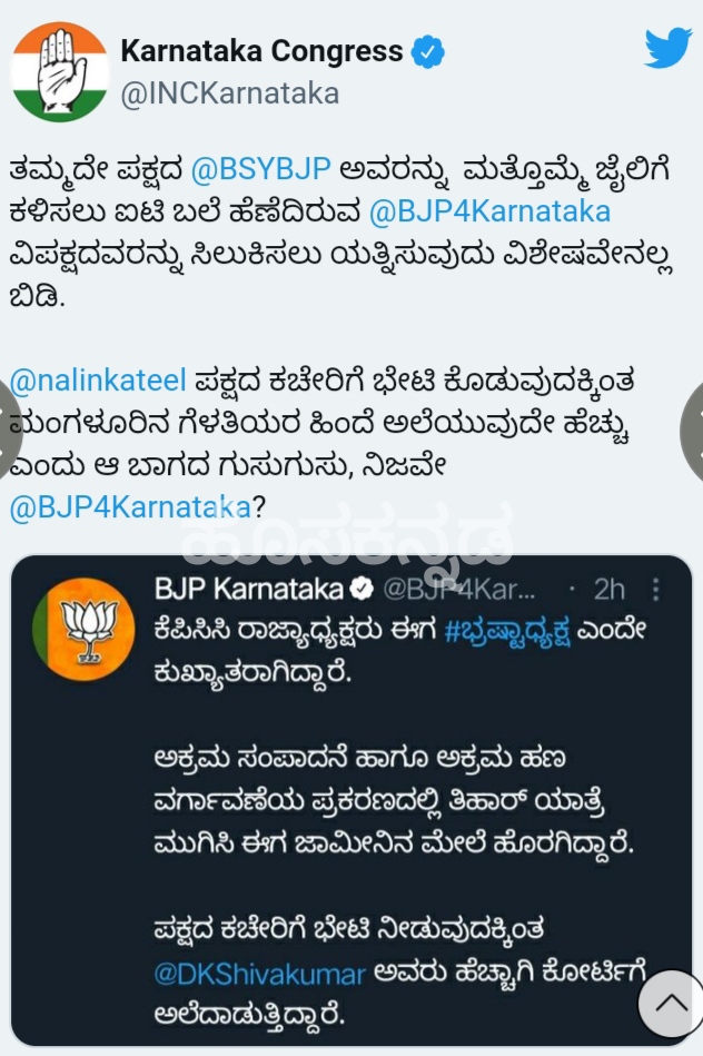 ಕೆಪಿಸಿಸಿ ರಾಜ್ಯಾಧ್ಯಕ್ಷ ಡಿಕೆಶಿ ಕೋರ್ಟ್ ಗೆ ಅಲೆದರೆ, ಬಿಜೆಪಿ ರಾಜ್ಯಾಧ್ಯಕ್ಷ ನಳಿನ್ ಕುಮಾರ್ ಕಟೀಲ್ ಮಂಗಳೂರಿನ ಗೆಳತಿಯರ ಹಿಂದೆ ಅಲೆಯುತ್ತಾರೆ!!ಪರಸ್ಪರ ಟ್ವೀಟ್ ಮಾಡಿಕೊಂಡ ಕಾಂಗ್ರೆಸ್ v/s ಬಿಜೆಪಿ