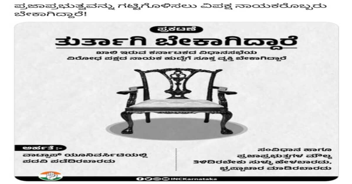 ಬಿಜೆಪಿ ಪಕ್ಷವು ವಿರೋಧ ಪಕ್ಷದ ನಾಯಕನನ್ನು ಆಯ್ಕೆ ಮಾಡುವಲ್ಲಿ ವಿಳಂಬ ಮತ್ತು ಅಸಮರ್ಥತೆಯನ್ನು ಸರಿಯಾಗಿ ಬಳಸಿಕೊಂಡ ಕರ್ನಾಟಕ ಕಾಂಗ್ರೆಸ್ ಪಕ್ಷವು ಈ ಮೂಲಕ ಬಿಜೆಪಿಯನ್ನು ಮತ್ತಷ್ಟು ಲೇಔಟ್ ಗೆ ಒಳಪಡಿಸಿದೆ. ತುರ್ತಾಗಿ ಬೇಕಾಗಿದ್ದಾರೆ: ವಿರೋಧ ಪಕ್ಷದ ನಾಯಕರೊಬ್ಬರು ಬೇಕಾಗಿದ್ದಾರೆ ಎಂದು ಬರೆದ ಖಾಲಿ ಕುರ್ಚಿಯ ಫೋಟೋ ಲಗತ್ತಿಸಿ ಕಾಂಗ್ರೆಸ್ ಈ ಬೆಳಿಗ್ಗೆ ಬಿಜೆಪಿಯನ್ನು ಕೀಟಲೆ ಮಾಡಿದೆ. ಜೊತೆಗೆ ವಿರೋಧ ಪಕ್ಷದ ನಾಯಕನ ಹುದ್ದೆಗೆ ಬೇಕಾದ ಅರ್ಹತೆಯನ್ನು ಕೂಡ ಪಟ್ಟಿ ಮಾಡಿದೆ.