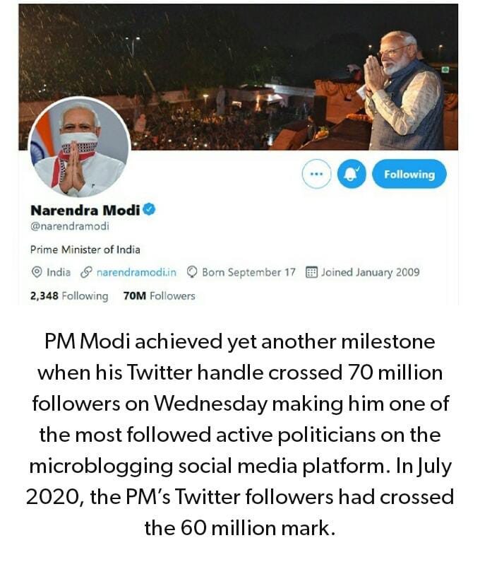 ಸೋಶಿಯಲ್ ಮೀಡಿಯಾ ವನ್ನು ಸಮರ್ಥವಾಗಿ ಬಳಸಿಕೊಳ್ಳುತ್ತಿರುವ ಪ್ರಧಾನಿ ಮೋದಿ ಅವರ ಟ್ವಿಟ್ಟರ್ ಖಾತೆ ಪ್ರಸ್ತುತ 70 ಮಿಲಿಯನ್ (7 ಕೋಟಿ) ಹಿಂಬಾಲಕರನ್ನು ಹೊಂದಿದೆ. ಆ ಮೂಲಕ ಅಮೆರಿಕದ ಮಾಜಿ ಅಧ್ಯಕ್ಷ ಟ್ರಂಪ್ ಅವರನ್ನು ಹಿಂದಿಕ್ಕಿ ಟ್ವಿಟರ್ನಲ್ಲಿ ಅತೀ ಹೆಚ್ಚು ಹಿಂಬಾಲಕರನ್ನು ಹೊಂದಿದೆ ರಾಜಕಾರಣಿಗಳ ಪೈಕಿ ಅಗ್ರ ಶ್ರೇಯಾಂಕಕ್ಕೆ ಮಾಡಿ ತಲುಪಿದ್ದಾರೆ.