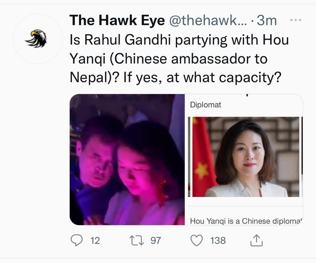 ಕಾಂಗ್ರೆಸ್‌ ನಾಯಕ ರಾಹುಲ್‌ ಗಾಂಧಿ ಮತ್ತು ಚೈನೀಸ್‌ ಅಂಬಾಸಿಡರ್‌ ಒಬ್ಬರ ಜೊತೆ ನೈಟ್‌ ಪಾರ್ಟಿಯಲ್ಲಿ ಪಾಲ್ಗೊಂಡಿರುವುದು ವೀಡಿಯೋದಲ್ಲಿ ಕಾಣಿಸುತ್ತದೆ. ಈ ವೀಡಿಯೋಗೆ ನೆಟ್ಟಿಗರು ಭಾರೀ ಕಮೆಂಟ್‌ ಮಾಡುತ್ತಿದ್ದಾರೆ. ಇದಕ್ಕೆ ಕಾಂಗ್ರೆಸ್‌ ಸ್ಪಷ್ಟನೆ ನೀಡಿದ್ದು, “ರಾಹುಲ್‌ ಗಾಂಧಿ ನೇಪಾಳದ ಕಠ್ಮಂಡುವಿನಲ್ಲಿ ನಡೆದ ತನ್ನ ಆಪ್ತರೊಬ್ಬರ ವಿವಾಹ ಸಮಾರಂಭದಲ್ಲಿ ಪಾಲ್ಗೊಳ್ಳಲು ತೆರಳಿದ್ದಾರೆ” ಎಂದು ಹೇಳಿದೆ.