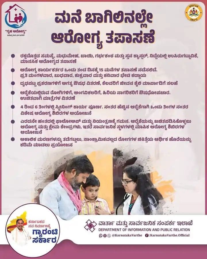 ಹೌದು, ಇನ್ಮುಂದೆ ಗ್ರಾಮೀಣ ಜನರ ಮನೆ ಬಾಗಿಲಿಗೆ ಬರಲಿದೆ ‘ಗೃಹ ಆರೋಗ್ಯ, ಈ ಯೋಜನೆಯಡಿ (Government scheme) ಗ್ರಾಮೀಣ ಪ್ರದೇಶದ 30 ವರ್ಷ ಮೇಲ್ಪಟ್ಟ ಎಲ್ಲಾ ನಾಗರಿಕರಿಗೂ ಸಕ್ಕರೆ ಕಾಯಿಲೆ, ರಕ್ತದೊತ್ತಡ (ಬಿಪಿ), ಬಾಯಿ, ಸ್ತನ, ಗರ್ಭಕಂಠದ ಕ್ಯಾನ್ಸರ್‌ ಹಾಗೂ ಮಾನಸಿಕ ಆರೋಗ್ಯಕ್ಕೆ ಸಂಬಂಧಿಸಿದ ಪ್ರಾಥಮಿಕ ಹಂತದ ತಪಾಸಣೆಗಳು ಮನೆ ಬಾಗಿಲಲ್ಲಿ ದೊರೆಯಲಿವೆ.