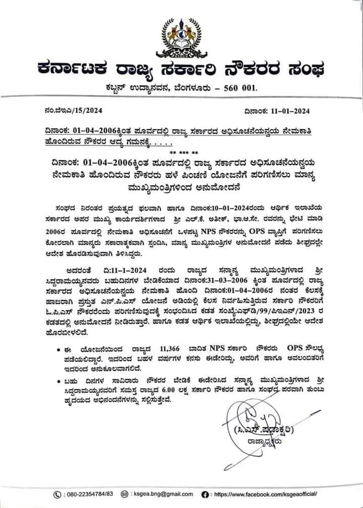 ಮುಖ್ಯಮಂತ್ರಿಗಳಾದ ಸಿದ್ದರಾಮಯ್ಯನವರು ಬಹುದಿನಗಳ ಬೇಡಿಕೆಯಾದ 31-03-2006 ಕ್ಕಿಂತ ಮೊದಲು ರಾಜ್ಯ ಸರ್ಕಾರದ ಅಧಿಸೂಚನೆಯನ್ವಯ ನೇಮಕಾತಿ ಹೊಂದಿದ್ದು ಅದೇ ರೀತಿ 01-04-2006ರ ನಂತರ ಕೆಲಸಕ್ಕೆ ಹಾಜರಾಗಿ ಪ್ರಸ್ತುತ ಎನ್.ಪಿ.ಎಸ್ ಯೋಜನೆ ಅಡಿಯಲ್ಲಿ ಕೆಲಸ ನಿರ್ವಹಿಸುತ್ತಿರುವ ಸರ್ಕಾರಿ ನೌಕರರಿಗೆ ಓ.ಪಿ.ಎಸ್ ನೌಕರರೆಂದು ಪರಿಗಣಿಸುವುದಕ್ಕೆ ಅನುಮೋದನೆ ನೀಡಿದ್ದಾರೆ ಎಂದು ತಿಳಿದುಬಂದಿದೆ. ಈ ಕಡತ ಆರ್ಥಿಕ ಇಲಾಖೆಯಲ್ಲಿದ್ದು, ಶೀಘ್ರದಲ್ಲಿಯೇ ಆದೇಶ ಹೊರಬೀಳಲಿದೆ ಎನ್ನಲಾಗಿದೆ.