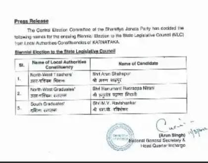 ವಾಯುವ್ಯ ಶಿಕ್ಷಕರ ಕ್ಷೇತ್ರಕ್ಕೆ ಅರುಣ ಶಹಾಪುರ, ವಾಯುವ್ಯ ಪದವೀಧರರ ಕ್ಷೇತ್ರಕ್ಕೆ ಹನುಮಂತ ನಿರಾಣಿ ಮತ್ತು ದಕ್ಷಿಣ ಪದವೀಧರ ಕ್ಷೇತ್ರಕ್ಕೆ ಎಂ.ವಿ. ರಾಜಶೇಖರ್ ಅವರನ್ನು ಅಭ್ಯರ್ಥಿಗಳನ್ನಾಗಿ ಘೋಷಿಸಲಾಗಿದೆ.