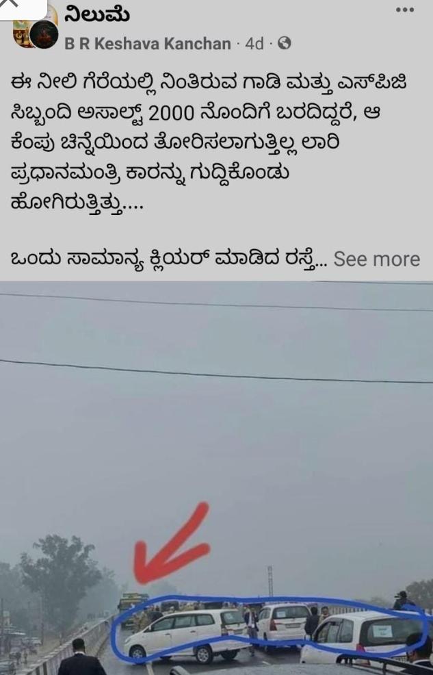 ಇಡೀ ಪ್ರಕರಣದ ಇನ್ನೊಂದು ಸತ್ಯ ಏನೆಂದರೆ,ಪ್ರಧಾನಿ ಫ್ಲೈ ಓವರ್ ಮೇಲೆ ನಿಂತಿದ್ದಾಗ ಅಲ್ಲಿ ಯಾವ ಲಾರಿಯೂ ಇರಲಿಲ್ಲ, ಅಲ್ಲಿದ್ದುದು ಕೇವಲ ಮಿನಿ ಬಸ್, ಹಾಗೂ ಪ್ರಧಾನಿ ಕಾರಿಗೆ ಗುದ್ದುವ-ಅಥವಾ ಗುದ್ದುತ್ತಿತ್ತು ಎಂದು ಈ ವರೆಗೂ ಯಾವ ಮಾಧ್ಯಮವೂ ಸುದ್ದಿ ಬಿತ್ತರಿಸಲಿಲ್ಲ.ಒಟ್ಟಾರೆಯಾಗಿ ಏನೇ ವಿಷಯ ಇದ್ದರೂ ಕೆಲ ಒಂದೇ ಪಕ್ಷದ ಅಥವಾ ಒಂದೇ ಬಣಕ್ಕೆ ಹೊಂದಿಕೊಂಡಿರುವ ಬಲಪಂಥಿಯರು ಈ ರೀತಿಯ ಸುಳ್ಳು ಸುದ್ದಿ ಹಬ್ಬಿಸಿ ಕಿಡಿಹಚ್ಚಲು ಪ್ರಯತ್ನಿಸುತ್ತಾರೆ.