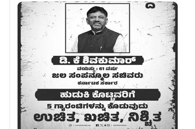 ಕಾಂಗ್ರೆಸ್ ಚುನಾವಣಾ ಪ್ರಚಾರದ ಸಂದರ್ಭ ದೊಡ್ಡಮಟ್ಟದಲ್ಲಿ ನೆರವಾದವರ ಋಣವನ್ನು ತೀರಿಸುವ ಪ್ರಯತ್ನ ಮಾಡುತ್ತಿದೆ. ಇದರ ಜೊತೆಗೆ ಲೋಕಸಭೆ ಚುನಾವಣೆಯ ನಂತರ ಸಿಎಂ ಕುರ್ಚಿ ಭದ್ರಪಡಿಸಿಕೊಳ್ಳಲು ಲಾಬಿ ಮಾಡುವ ಸಲುವಾಗಿ ಕಾವೇರಿಯನ್ನು ಸ್ಟಾಲಿನ್ ನಾಡಿಗೆ ಬೇಕಾಬಿಟ್ಟಿಯಾಗಿ ಹರಿಬಿಟ್ಟ ಜಲಸಂಪನ್ಮೂಲ ಸಚಿವರಾದ ಡಿ.ಕೆ. ಶಿವಕುಮಾರ್ ಕಾಣೆಯಾಗಿ ಬಿಟ್ಟಿದ್ದಾರೆ. ಹಾಗಾಗಿ, ದಯಮಾಡಿ, ಯಾರಾದರೂ ಅವರನ್ನು ಹುಡುಕಿ ಕೊಡಿ ಎಂದು ಮನವಿ ಮಾಡುವ ಹಾಗೆ ಬಿಜೆಪಿ ಎಕ್ಸ್ ನಲ್ಲಿ ಪೋಸ್ಟರ್ ಬಿಡುಗಡೆ ಮಾಡಿದ್ದು, ಈ ಮೂಲಕ ಕಾಂಗ್ರೆಸ್ ಪಕ್ಷದ ಕಾಲೆಳೆಯುವ ಪ್ರಯತ್ನಕ್ಕೆ ಕೈ ಹಾಕಿದೆ.