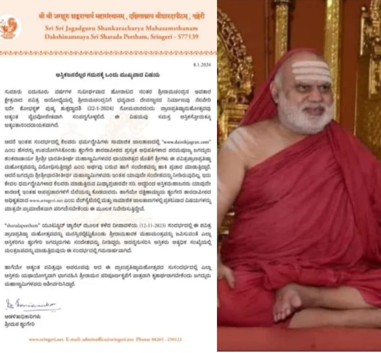 ರಾಮಮಂದಿರ ಪ್ರತಿಷ್ಠಾಪನೆಗೆ ಶೃಂಗೇರಿ ಪೀಠದಿಂದ ಅಸಮಾಧಾನ ವ್ಯಕ್ತಪಡಿಸಿದ್ದಾರೆ ಎಂಬ ರೀತಿ ಎಲ್ಲೆಡೆ ಸುದ್ದಿ ಹಬ್ಬಿರುವುದಕ್ಕೆ ಶೃಂಗೇರಿ ಪೀಠಾಧೀಶರು ಈ ರೀತಿಯ ಯಾವುದೇ ಪೋಸ್ಟ್ ಅನ್ನೂ ಮಠದ ವತಿಯಿಂದ ಪ್ರಕಟಿಸಲಾಗಿಲ್ಲ ಎಂಬುದನ್ನು ಸ್ಪಷ್ಟಪಡಿಸಿದ್ದಾರೆ. ದುಷ್ಕರ್ಮಿಗಳು ಸಾಮಾಜಿಕ ಜಾಲತಾಣಗಳಲ್ಲಿ ವೆಬ್ ಸೈಟ್ ಒಂದರ ಹೆಸರು ಬಳಸಿ ದಕ್ಷಿಣಾಮಯ ಶೃಂಗೇರಿ ಶಾರದ ಪೀಠಾಧೀಶ್ವರ, ಪರಮಪೂಜ್ಯರ ಚಿತ್ರವಿರುವ ಪೋಸ್ಟ್ಗಳು ಹರಿದಾಡಿರುವುದು ನಮ್ಮ ಗಮನಕ್ಕೆ ಬಂದಿದೆ. ಈಗ ಹರಿದಾಡಿರುವುದು ಸುಳ್ಳು ಪೋಸ್ಟ್ ಎಂದು ತಿಳಿಸಿದ್ದಾರೆ. ಈ ಬಗ್ಗೆ ಮಠದಿಂದ ಅಧಿಕೃತ ಪ್ರಕಟಣೆ ಹೊರಡಿಸಲಾಗಿದೆ.