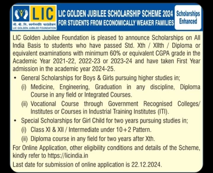 LIC Scholarship 2024: ಎಲ್ಐಸಿ (ಭಾರತೀಯ ಜೀವ ವಿಮಾ ನಿಗಮ) ಆರ್ಥಿಕವಾಗಿ ದುರ್ಬಲ ಕುಟುಂಬಗಳ ಮಕ್ಕಳನ್ನು ಗಮನದಲ್ಲಿಟ್ಟುಕೊಂಡು ಗೋಲ್ಡನ್ ಜುಬಿಲಿ ಸ್ಕಾಲರ್ಶಿಪ್ 2024 ಅನ್ನು ಪ್ರಾರಂಭಿಸಿದೆ.