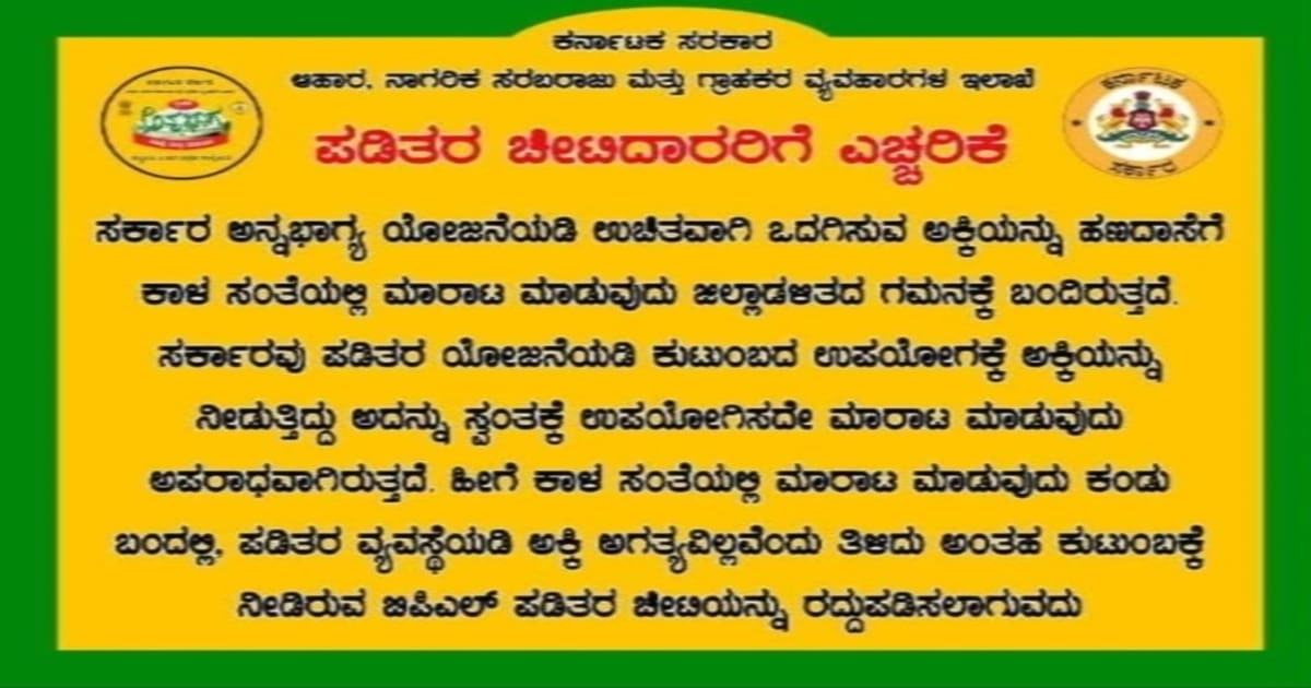 BPL card: ಪಡಿತರ ಚೀಟಿದಾರರು (BPL card) ತಮಗೆ ನೀಡಿದ ಆಹಾರಧಾನ್ಯವನ್ನು ಕಾಳಸಂತೆಯಲ್ಲಿ ಮಾರಾಟ ಮಾಡಿದರೆ ಅಂತಹವರ ಪಡಿತರ ಚೀಟಿಯನ್ನು ರದ್ದುಪಡಿಸಲು ಕ್ರಮವಹಿಸಲಾಗುವುದು ಎಂದು ಆಹಾರ, ನಾಗರಿಕ ಸರಬ ಮತ್ತು ಗ್ರಾಹಕರ ವ್ಯವಹಾರಗಳ ಇಲಾಖೆಯ ಜಂಟಿ ನಿರ್ದೇಶಕರು ಪ್ರಕಟಣೆಯಲ್ಲಿ ತಿಳಿಸಿದ್ದಾರೆ. ಒಂದು …
