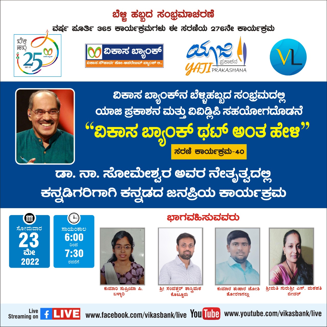 ವಿಜಯನಗರ(ಹೊಸಪೇಟೆ): ವಿಕಾಸ ಬ್ಯಾಂಕಿನ ಬೆಳ್ಳಿಹಬ್ಬದ ಸಂಭ್ರಮಾಚರಣೆಯ ಪ್ರಯುಕ್ತ, ಯಾಜಿ ಪ್ರಕಾಶನ ಮತ್ತು ವಿವಿಡ್ಲಿಪಿ ಸಹಯೋಗದೊಡನೆ ಡಾ.ನಾ. ಸೋಮೇಶ್ವರ ಅವರ ನೇತೃತ್ವದಲ್ಲಿ ಕನ್ನಡಿಗರಿಗಾಗಿ ಕನ್ನಡದ ಜನಪ್ರಿಯ “ವಿಕಾಸ ಥಟ್ ಅಂತ ಹೇಳಿ” ಸರಣಿ ಕಾರ್ಯಕ್ರಮ, ಸೋಮವಾರದಂದು ಆನ್ಲೈನ್ ವೇದಿಕೆಯಲ್ಲಿ ನಡೆಯಿತು. ಈ ವಾರದ …