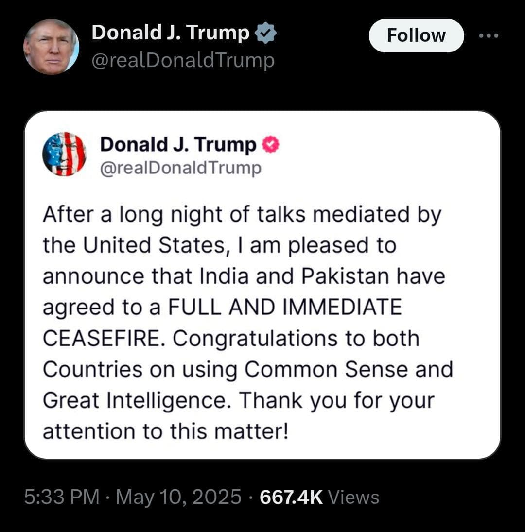 India Pakistan War: ಭಾರತ ಪಾಕಿಸ್ತಾನದ ನಡುವೆ ನಡೆಯುತ್ತಿರುವ ಯುದ್ಧಕ್ಕೆ ವಿರಾಮ ಒಪ್ಪಂದವಾಗಿದೆ ಎಂದು ಅಮೆರಿಕ ಅಧ್ಯಕ್ಷ ಡೋನಾಲ್ಡ್ ಟ್ರಂಫ್ ಘೋಷಣೆ ಮಾಡಿದ್ದಾರೆ.