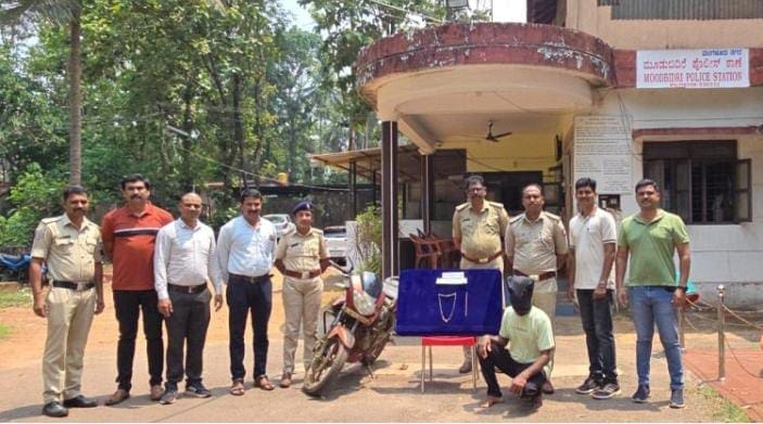 Crime: ಮಾ. 31ರಂದು ಬೆಳುವಾಯಿ ಗ್ರಾಮದ ಗುಜ್ಜರ ಗುಂಡಿ ಎಂಬಲ್ಲಿ, 70ರ ಹರೆಯದ ವೃದ್ದೆ ಇಂದಿರಾ ಎಂಬದರ ಕುತ್ತಿಗೆಯಿಂದ ಚಿನ್ನದ ಕರಿಮಣಿ ಸರವನ್ನು ಎಳೆದೊಯ್ದು ಪರಾರಿಯಾಗಿದ್ದ ಆರೋಪಿ ಕಾಂತವಾರ ಸಮೀಪದ ಪ್ರಶಾಂತ್ ಸಾಲ್ಯಾನ್ ನನ್ನು ಮೂಡುಬಿದಿರೆ ಪೊಲೀಸರು ಬಂಧಿಸಿದ್ದಾರೆ.