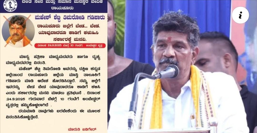 Raichur : ಧರ್ಮಸ್ಥಳದ (Dharmasthala) ಬುರುಡೆ ಪ್ರಕರಣ ಹಾಗೂ ಸೌಜನ್ಯ ಪ್ರಕರಣದಲ್ಲಿ ಹೋರಾಟ ನಡೆಸುತ್ತಿದ್ದ ಸಾಮಾಜಿಕ ಹೋರಾಟಗಾರ ಮಹೇಶ್ ಶೆಟ್ಟಿ ತಿಮರೋಡಿಯನ್ನು (Mahesh Shetty Thimarody) ಮಂಗಳೂರಿನಿಂದ ರಾಯಚೂರಿನ ಮಾನ್ವಿಗೆ ಗಡೀಪಾರು ಮಾಡಿ ಸಹಾಯಕ ಆಯುಕ್ತ ಸ್ಟೆಲ್ಲಾ ವರ್ಗೀಸ್ ಆದೇಶ ಹೊರಡಿಸಿದ್ದಾರೆ.