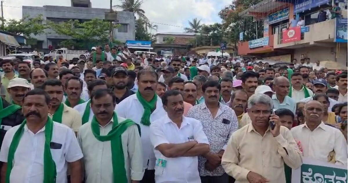 Protest: ಅರಣ್ಯ ಇಲಾಖೆಯ ಕ್ರಮದ ವಿರುದ್ದ ತೀವ್ರ ಆಕ್ರೋಶ ವ್ಯಕ್ತಪಡಿಸಿ ರೈತ ಸಂಘಟನೆ ಸೋಮವಾರಪೇಟೆ ಪಟ್ಟಣದ ಖಾಸಗಿ ಬಸ್ ನಿಲ್ದಾಣದಲ್ಲಿ ಮಾನವ ಸರಪಳಿ ರಚಿಸಿ,ನಂತರ ರೈತರು ಜೆ.ಸಿ. ವೇದಿಕೆಯಲ್ಲಿ ಬೃಹತ್ ರೈತ ಸಮಾವೇಶ ಹಮ್ಮಿಕೊಂಡಿದ್ದಾರೆ.