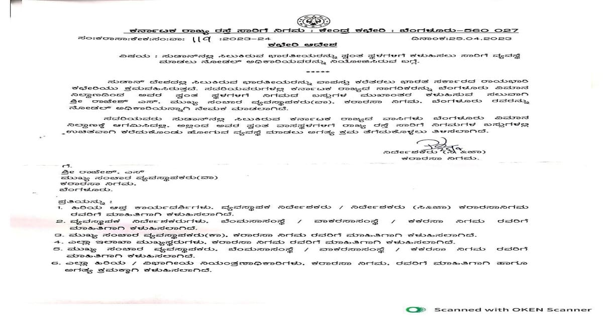 KSRTC free bus service:ಸುಡಾನ್‌ ಕದನದಲ್ಲಿ ಸಿಲುಕಿರುವ ಭಾರತೀಯರನ್ನು ಸ್ವಂತ ಸ್ಥಳಗಳಿಗೆ ಕಳುಹಿಸಲು ಸಾರಿಗೆ ವ್ಯವಸ್ಥೆ ಮಾಡಲು ನೋಡಲ್ ಅಧಿಕಾರಿಯವರನ್ನು ನಿಯೋಜಿಸಲಾಗಿದೆ ಎಂದ ಕರ್ನಾಟಕ ರಾಜ್ಯ ರಸ್ತೆ ಸಾರಿಗೆ(KSRTC) ನಿಗಮ ಆದೇಶ ಹೊರಡಿಸಿದೆ.